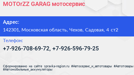 MOTOrZZ GARAG, мотосервис по адресу 142301, Московская область, Чехов, Садовая, 4 ст2 в дальнейшем Организация, размещена в следующих категориях: