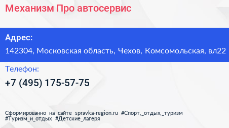 Механизм.Про, автосервис по адресу 142304, Московская область, Чехов, Комсомольская, вл22 в дальнейшем Организация, размещена в следующих категориях: