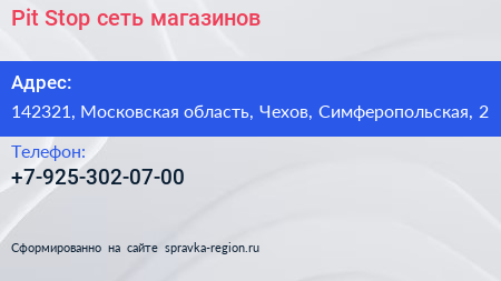 Pit-Stop, сеть магазинов по адресу 142321, Московская область, Чехов, Симферопольская, 2 в дальнейшем Организация, размещена в следующих категориях: