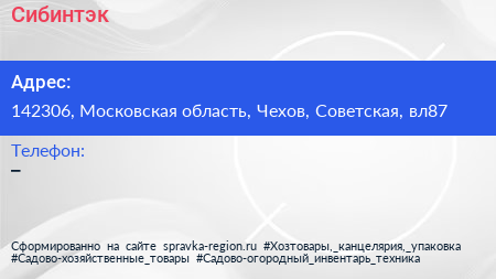 Сибинтэк по адресу 142306, Московская область, Чехов, Советская, вл87 в дальнейшем Организация, размещена в следующих категориях: