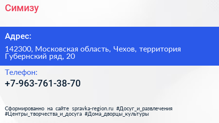 Симизу по адресу 142300, Московская область, Чехов, территория Губернский ряд, 20 в дальнейшем Организация, размещена в следующих категориях: