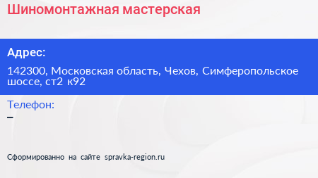 Шиномонтажная мастерская по адресу 142300, Московская область, Чехов, Симферопольское шоссе, ст2 к92 в дальнейшем Организация, размещена в следующих категориях: