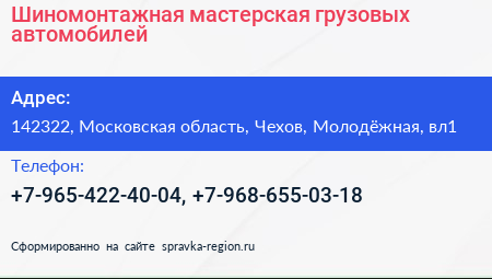 Шиномонтажная мастерская грузовых автомобилей по адресу 142322, Московская область, Чехов, Молодёжная, вл1 в дальнейшем Организация, размещена в следующих категориях: