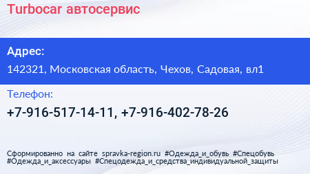 Turbocar, автосервис по адресу 142321, Московская область, Чехов, Садовая, вл1 в дальнейшем Организация, размещена в следующих категориях: