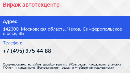 Вираж, автотехцентр по адресу 142300, Московская область, Чехов, Симферопольское шоссе, 8Б в дальнейшем Организация, размещена в следующих категориях: