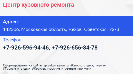 Центр кузовного ремонта по адресу 142306, Московская область, Чехов, Советская, 72/3 в дальнейшем Организация, размещена в следующих категориях: