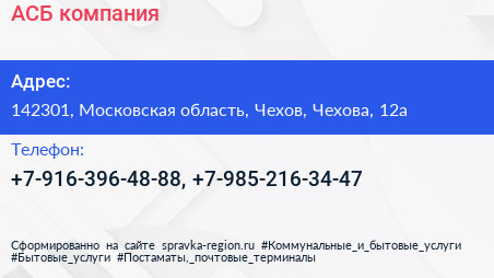 АСБ, компания по адресу 142301, Московская область, Чехов, Чехова, 12а в дальнейшем Организация, размещена в следующих категориях:
