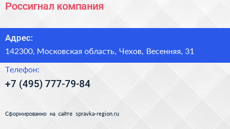Россигнал, компания по адресу 142300, Московская область, Чехов, Весенняя, 31 в дальнейшем Организация, размещена в следующих категориях: