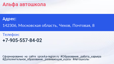 Альфа, автошкола по адресу 142306, Московская область, Чехов, Почтовая, 8 в дальнейшем Организация, размещена в следующих категориях:
