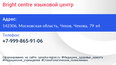 Bright centre, языковой центр по адресу 142306, Московская область, Чехов, Чехова, 79 к4 в дальнейшем Организация, размещена в следующих категориях: