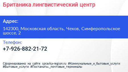 Британика, лингвистический центр по адресу 142300, Московская область, Чехов, Симферопольское шоссе, 2 в дальнейшем Организация, размещена в следующих категориях: