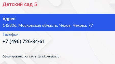 Детский сад №5 по адресу 142306, Московская область, Чехов, Чехова, 77 в дальнейшем Организация, размещена в следующих категориях: