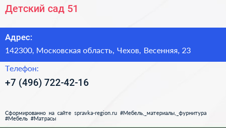 Детский сад №51 по адресу 142300, Московская область, Чехов, Весенняя, 23 в дальнейшем Организация, размещена в следующих категориях: