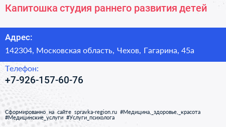 Капитошка, студия раннего развития детей по адресу 142304, Московская область, Чехов, Гагарина, 45а в дальнейшем Организация, размещена в следующих категориях: