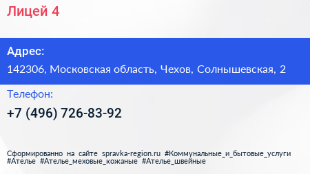 Лицей №4 по адресу 142306, Московская область, Чехов, Солнышевская, 2 в дальнейшем Организация, размещена в следующих категориях: