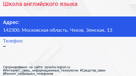 Школа английского языка по адресу 142300, Московская область, Чехов, Земская, 13 в дальнейшем Организация, размещена в следующих категориях: