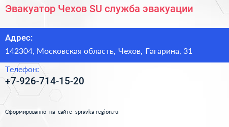 Эвакуатор-Чехов.SU, служба эвакуации по адресу 142304, Московская область, Чехов, Гагарина, 31 в дальнейшем Организация, размещена в следующих категориях:
