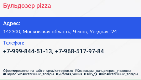 Бульдозер pizza по адресу 142300, Московская область, Чехов, Уездная, 24 в дальнейшем Организация, размещена в следующих категориях: