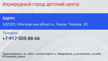 Изумрудный город, детский центр по адресу 142301, Московская область, Чехов, Чехова, 20 в дальнейшем Организация, размещена в следующих категориях: