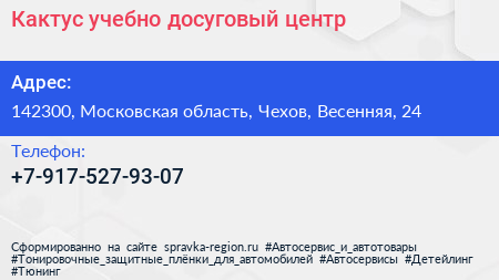 Кактус, учебно-досуговый центр по адресу 142300, Московская область, Чехов, Весенняя, 24 в дальнейшем Организация, размещена в следующих категориях: