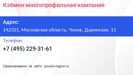 Кэбмен, многопрофильная компания по адресу 142321, Московская область, Чехов, Даринская, 15 в дальнейшем Организация, размещена в следующих категориях: