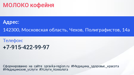 #МОЛОКО, кофейня по адресу 142300, Московская область, Чехов, Полиграфистов, 14а в дальнейшем Организация, размещена в следующих категориях: