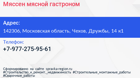 Мяссен, мясной гастроном по адресу 142306, Московская область, Чехов, Дружбы, 14 к1 в дальнейшем Организация, размещена в следующих категориях: