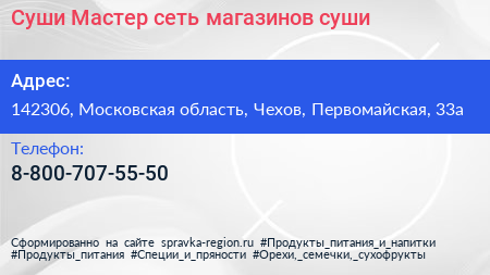 Суши Мастер, сеть магазинов суши по адресу 142306, Московская область, Чехов, Первомайская, 33а в дальнейшем Организация, размещена в следующих категориях: