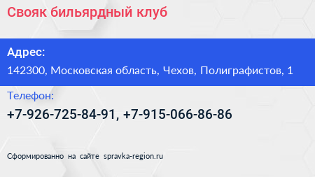 Свояк, бильярдный клуб по адресу 142300, Московская область, Чехов, Полиграфистов, 1 в дальнейшем Организация, размещена в следующих категориях: