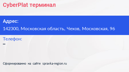 CyberPlat, терминал по адресу 142300, Московская область, Чехов, Московская, 96 в дальнейшем Организация, размещена в следующих категориях: