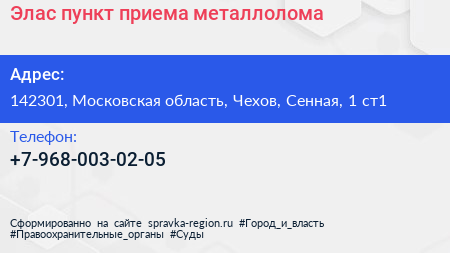 Элас, пункт приема металлолома по адресу 142301, Московская область, Чехов, Сенная, 1 ст1 в дальнейшем Организация, размещена в следующих категориях: