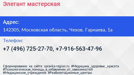Элегант, мастерская по адресу 142305, Московская область, Чехов, Гарнаева, 1а в дальнейшем Организация, размещена в следующих категориях: