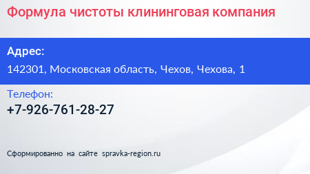 Формула чистоты, клининговая компания по адресу 142301, Московская область, Чехов, Чехова, 1 в дальнейшем Организация, размещена в следующих категориях: