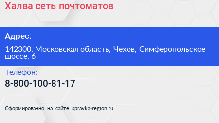 Халва, сеть почтоматов по адресу 142300, Московская область, Чехов, Симферопольское шоссе, 6 в дальнейшем Организация, размещена в следующих категориях: