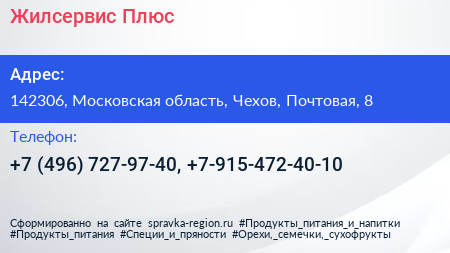 Жилсервис-Плюс по адресу 142306, Московская область, Чехов, Почтовая, 8 в дальнейшем Организация, размещена в следующих категориях: