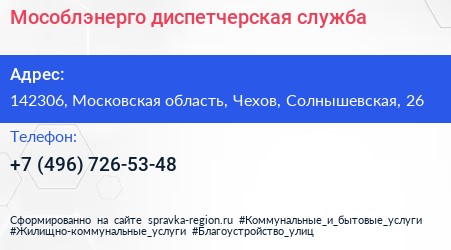Мособлэнерго, диспетчерская служба по адресу 142306, Московская область, Чехов, Солнышевская, 26 в дальнейшем Организация, размещена в следующих категориях: