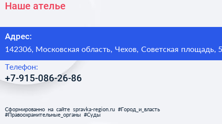 Наше, ателье по адресу 142306, Московская область, Чехов, Советская площадь, 5 в дальнейшем Организация, размещена в следующих категориях: