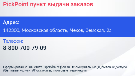 PickPoint, пункт выдачи заказов по адресу 142300, Московская область, Чехов, Земская, 2а в дальнейшем Организация, размещена в следующих категориях: