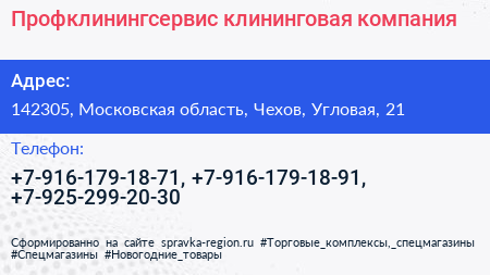 Профклинингсервис, клининговая компания по адресу 142305, Московская область, Чехов, Угловая, 21 в дальнейшем Организация, размещена в следующих категориях: