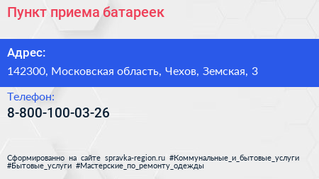 Пункт приема батареек по адресу 142300, Московская область, Чехов, Земская, 3 в дальнейшем Организация, размещена в следующих категориях: