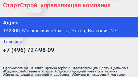 СтартСтрой+, управляющая компания по адресу 142300, Московская область, Чехов, Весенняя, 27 в дальнейшем Организация, размещена в следующих категориях: