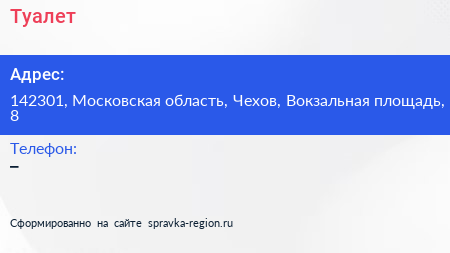 Туалет по адресу 142301, Московская область, Чехов, Вокзальная площадь, 8 в дальнейшем Организация, размещена в следующих категориях: