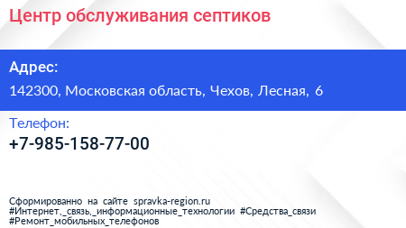 Центр обслуживания септиков по адресу 142300, Московская область, Чехов, Лесная, 6 в дальнейшем Организация, размещена в следующих категориях: