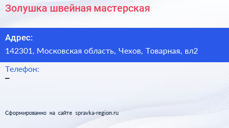 Золушка, швейная мастерская по адресу 142301, Московская область, Чехов, Товарная, вл2 в дальнейшем Организация, размещена в следующих категориях: