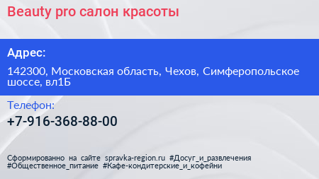 Beauty pro, салон красоты по адресу 142300, Московская область, Чехов, Симферопольское шоссе, вл1Б в дальнейшем Организация, размещена в следующих категориях: