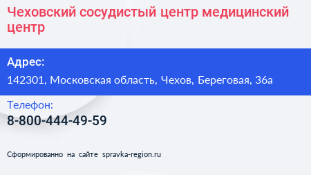 Чеховский сосудистый центр, медицинский центр по адресу 142301, Московская область, Чехов, Береговая, 36а в дальнейшем Организация, размещена в следующих категориях: