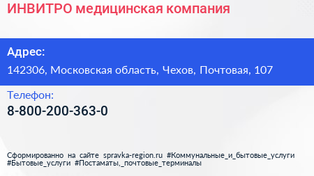 ИНВИТРО, медицинская компания по адресу 142306, Московская область, Чехов, Почтовая, 107 в дальнейшем Организация, размещена в следующих категориях:
