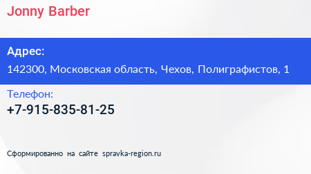 Jonny Barber по адресу 142300, Московская область, Чехов, Полиграфистов, 1 в дальнейшем Организация, размещена в следующих категориях: