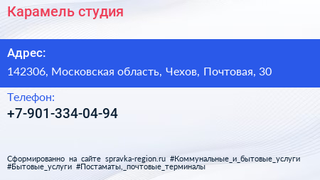 Карамель, студия по адресу 142306, Московская область, Чехов, Почтовая, 30 в дальнейшем Организация, размещена в следующих категориях: