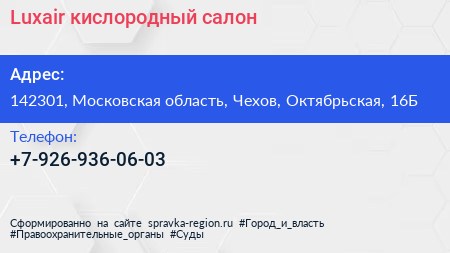 Luxair, кислородный салон по адресу 142301, Московская область, Чехов, Октябрьская, 16Б в дальнейшем Организация, размещена в следующих категориях: